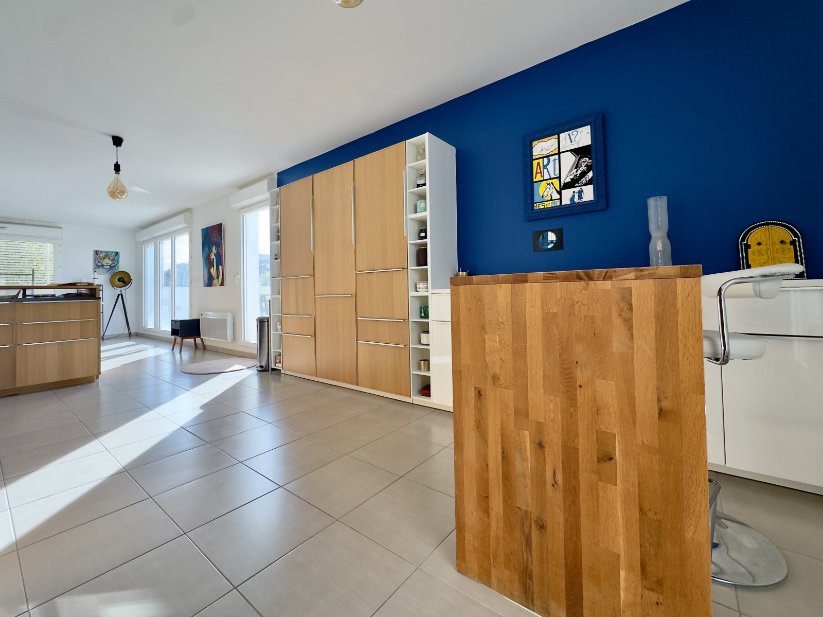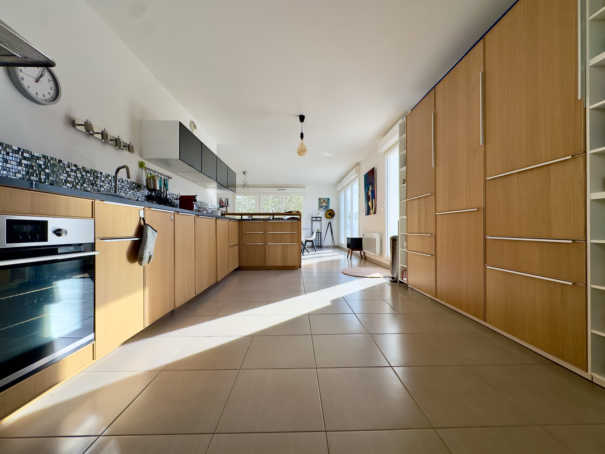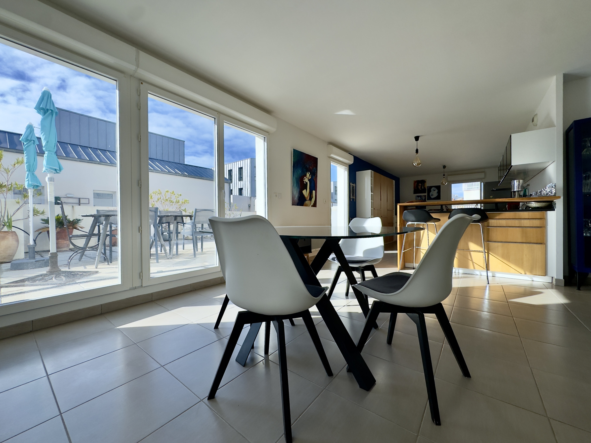 Une entrée vient servir une pièce de vie de plus de 65m2 avec cuisine ouverte équipée, entièrement ajourée sur la terrasse et parfaitement exposée.